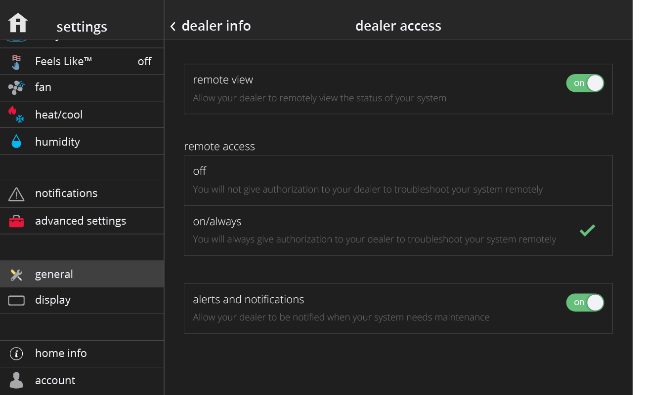 2)Remote Access: When off is selected, your dealer will not have authorization to troubleshoot your system remotely. If you have "On/Always" selected, you’re giving authorization to your dealer to troubleshoot your system remotely at any time (On/Always is selected by default).