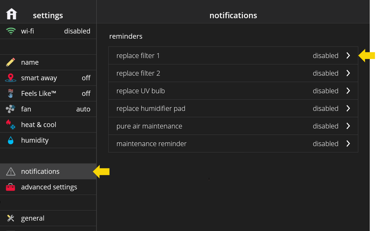 - From home screen go to menu (top right of home screen), select settings, then scroll down to notifications and select, then select PureAir maintenance, then select calendar, run time or disabled.