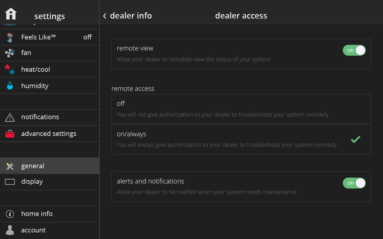 We recommend that you allow your dealer to have remote access to your system, this way your dealer is able to quickly troubleshoot any issues, alerts, or warnings that may occur remotely. However, you do have the ability to limit the level of access from full control to view-only privileges.